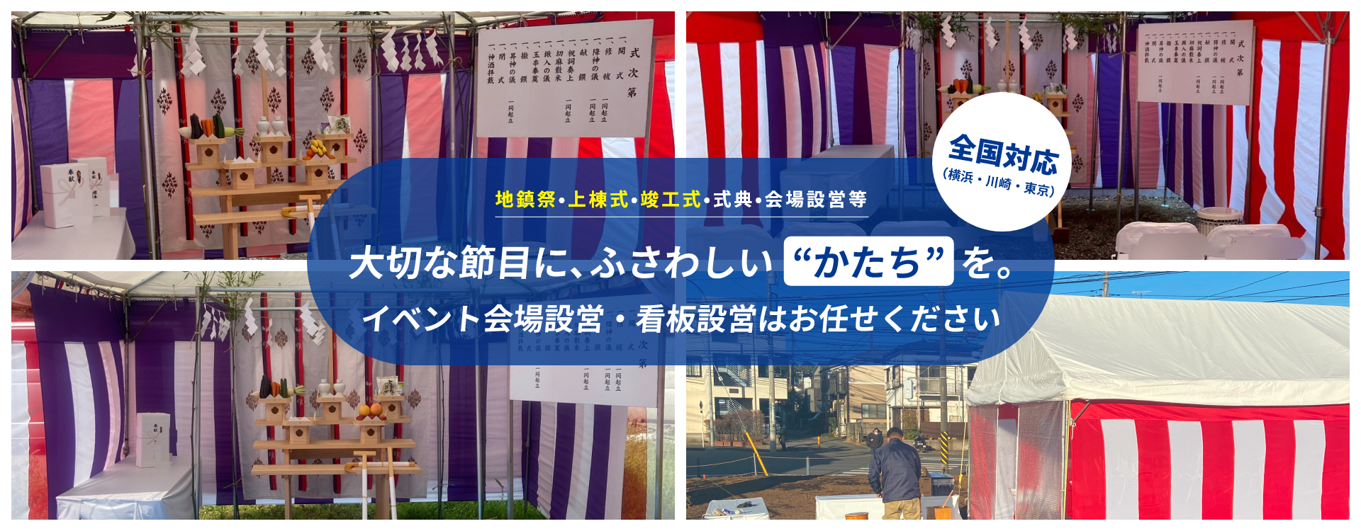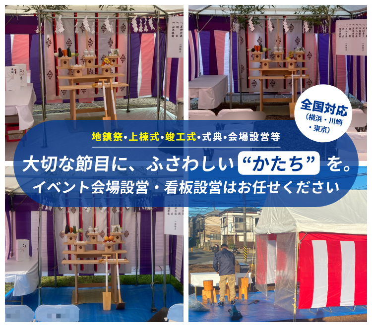 当社は、地鎮祭・上棟式・竣工式の設営や吊り看板の制作・設置(式典)を中心に、